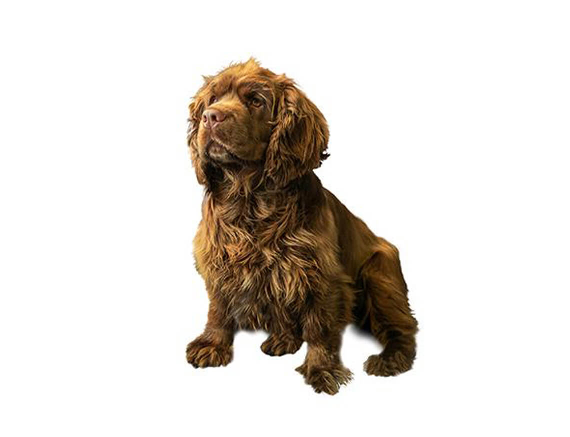 سَسكس سبانيل كلب قوي البنية، متين على أرجل قصيرة وقوية، له فراء قصير وكثيف بلون كبد ذهبي غني، يتدرج إلى ذهبي عند أطراف الشعر. رأسه عريض وتعابير وجهه جدية نوعًا ما وفضولية، مما يجعله رفيقًا جذابًا.