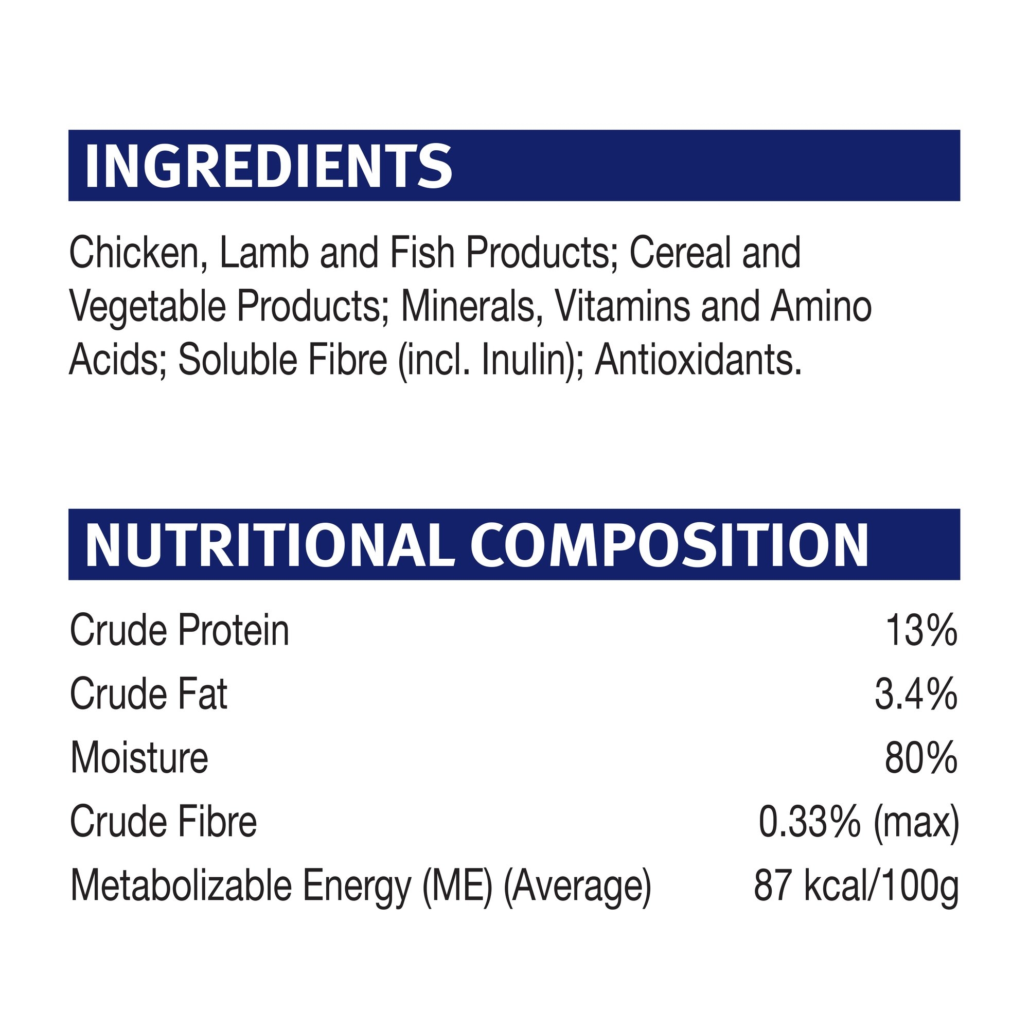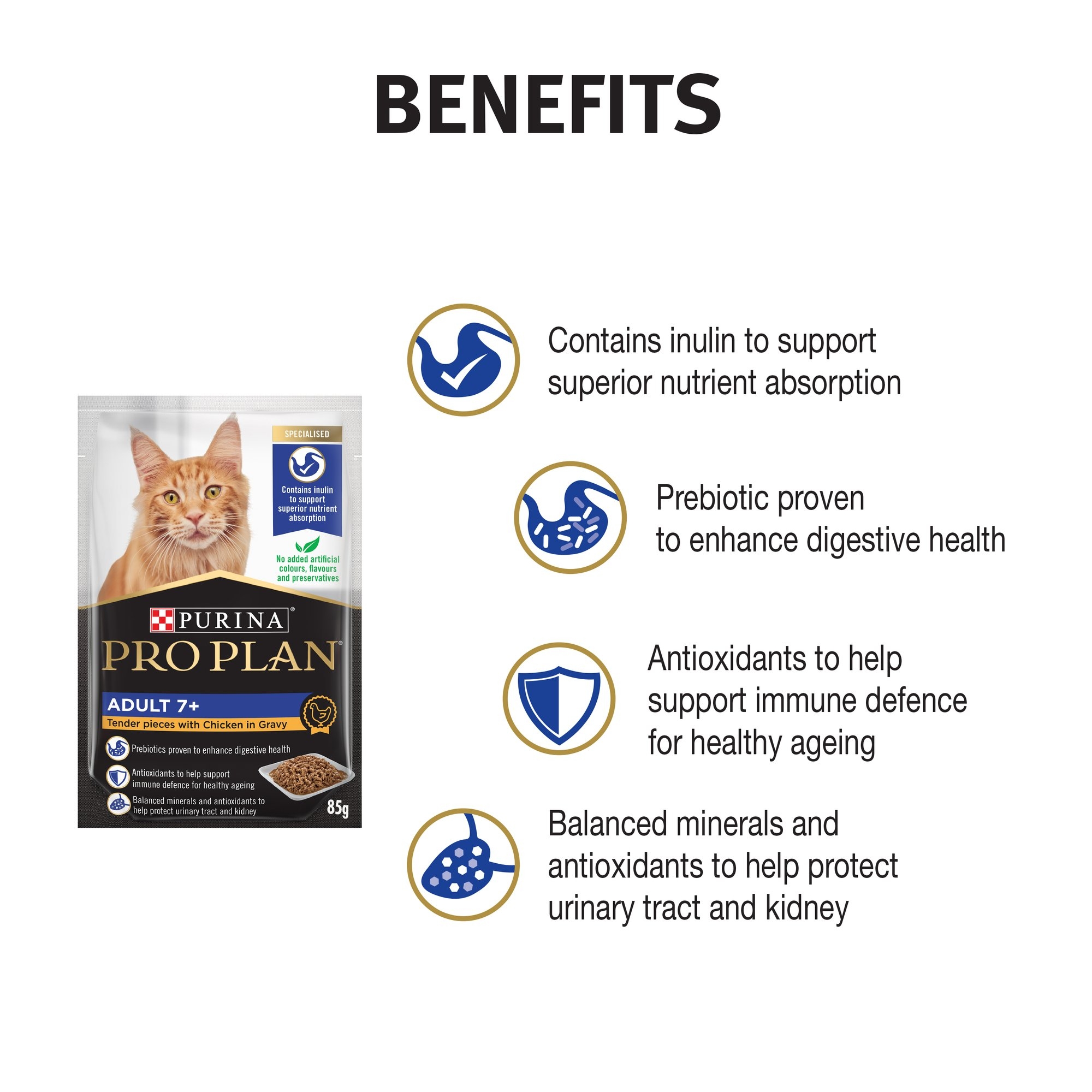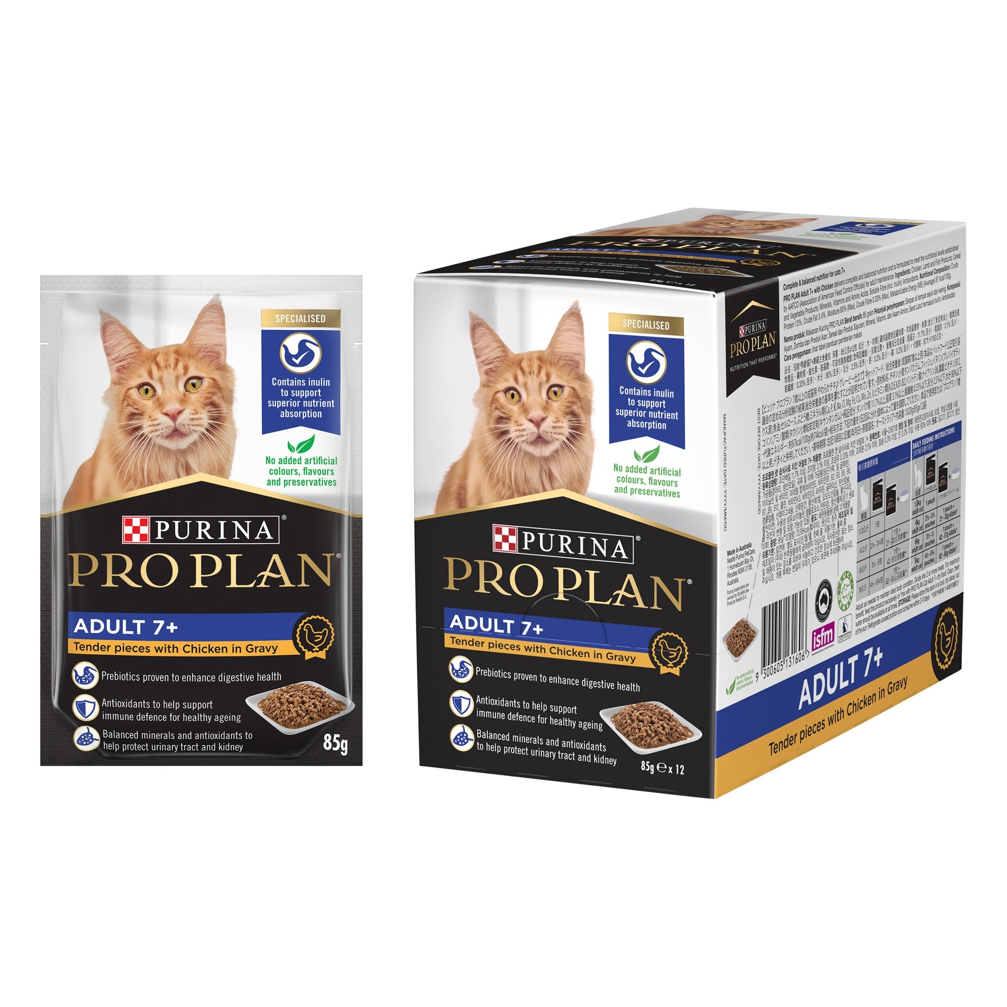 بروبلان ® طعام القطط الرطب فى المرق مع الدجاج للبالغين 7+ يوفر تغذية كاملة ومتوازنة وتمت صياغته لتلبية المستويات الغذائية التي وضعتها AAFCO (رابطة مسؤولي التحكم في الأعلاف الأمريكية) لصيانة البالغين.