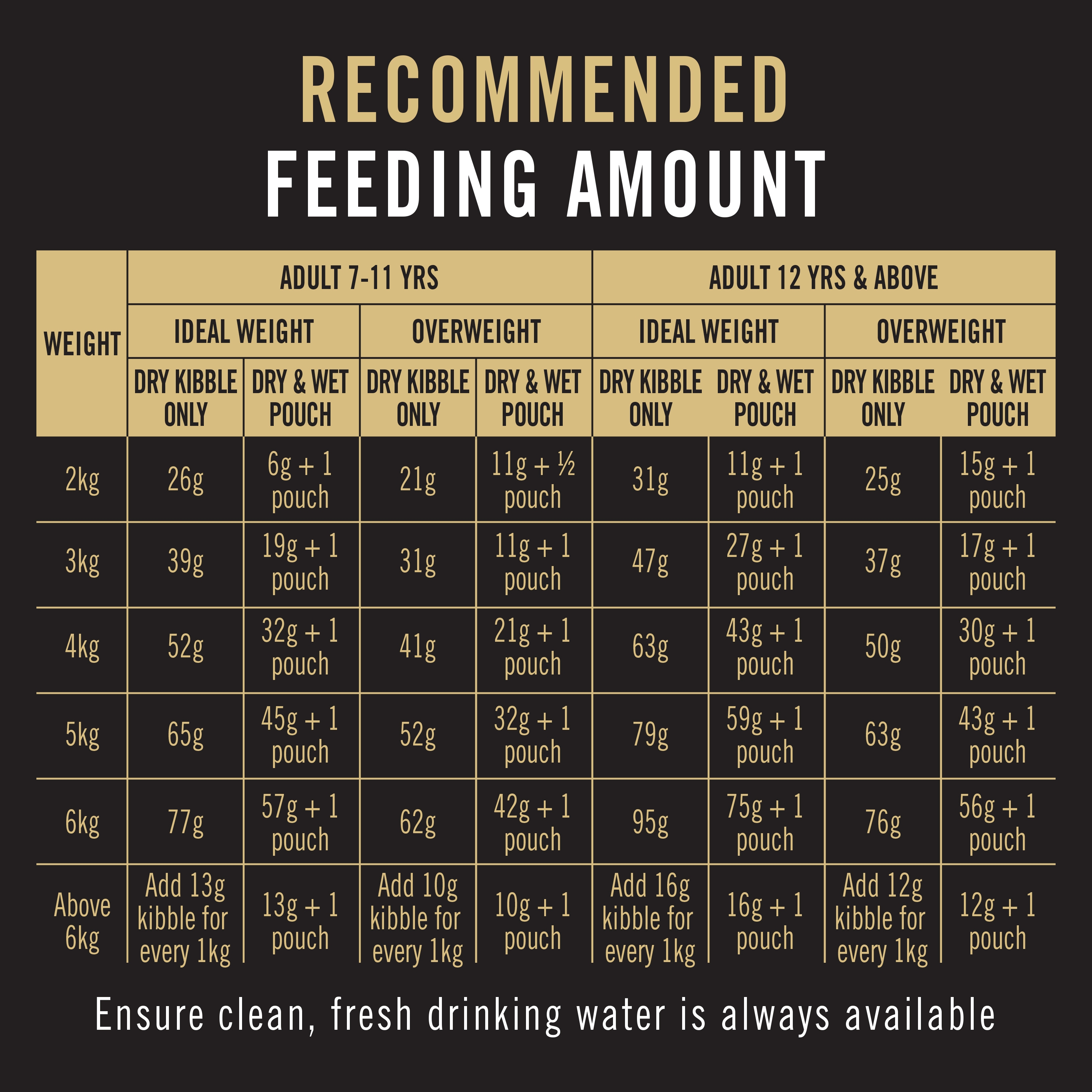 | أكثر من 6 كجم | أضف 13 جم من الطعام الجاف لكل كيلوجرام | 13 جم + 1 كيس | أضف 10 جم من الطعام الجاف لكل كيلوجرام | 10 جم + 1 كيس | أضف 16 جم من الطعام الجاف لكل كيلوجرام | 16 جم + 1 كيس | أضف 12 جم من الطعام الجاف لكل كيلوجرام | 12 جم + 1 كيس |