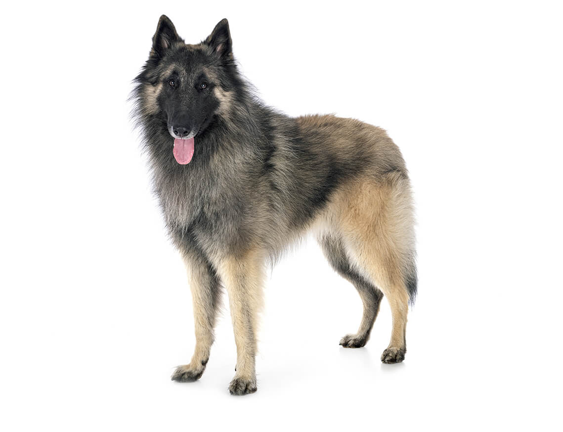 The Tervueren is a medium-sized, long-haired dog that appears square in its outline. Although they are often confused with the 'long-haired German Shepherd Dog' by the general public, they are squarer in profile; lighter in bone with a more refined head. The Terveuren dog breed is fawn, red or grey in colour with black shading on the hair tips. Adult dogs should measure between 61-66cm and females 56-61cm. They weigh between 27.5-28.5kg.