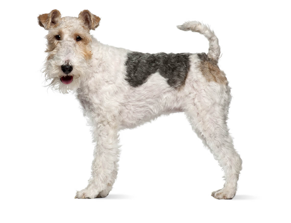 He might be small, but the short-backed, muscular Wire Fox Terrier exudes strength. The thick, wiry coat is predominantly white with black, tan, or black and tan markings. Adult male dogs are 39cm tall or under and weigh about 8kg, and females are slightly smaller.