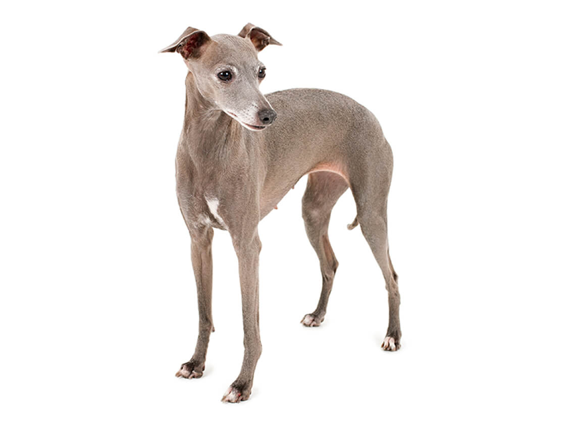 This is an elegant and slender dog, looking like a standard Greyhound but in miniature. The coat is smooth and glossy and can come in a variety of shades. The head is narrow with a very fine muzzle and ears are softly folded and set high on the head. The spine slopes gently and there is a defined tuck-up in the loins. The gait is high stepping and free.