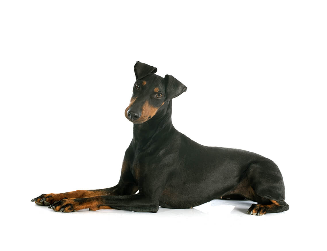 The Manchester Terrier is a neat, elegant, yet workmanlike dog with a smooth glossy coat. The coat is black with distinct tan markings as set out by the official breed standard. Ears are small, V-shaped and neat, sitting high on the head. While this is a small dog, the Manchester Terrier is not delicate or frail, but compact and with substance.